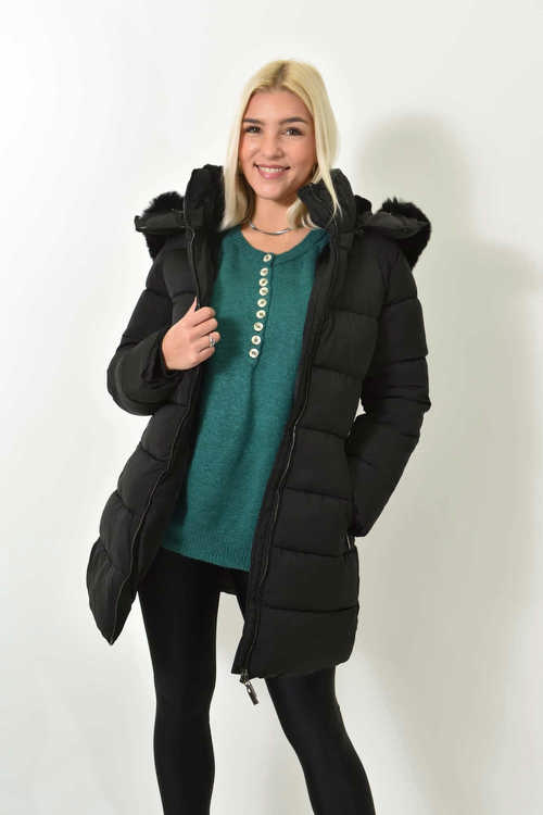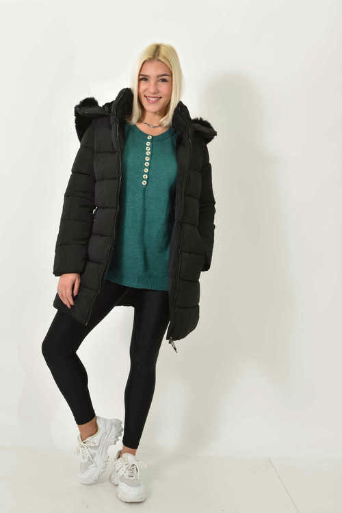 Καπιτονέ Μακρύ Μπουφάν με Κουκούλα Μαύρο
