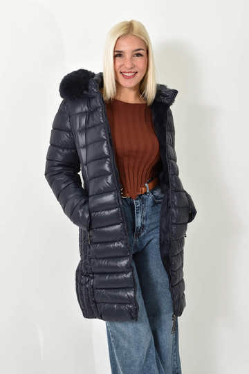 Μακρύ Μπουφάν Μεταλλικό Με Κουκούλα Και Γούνα